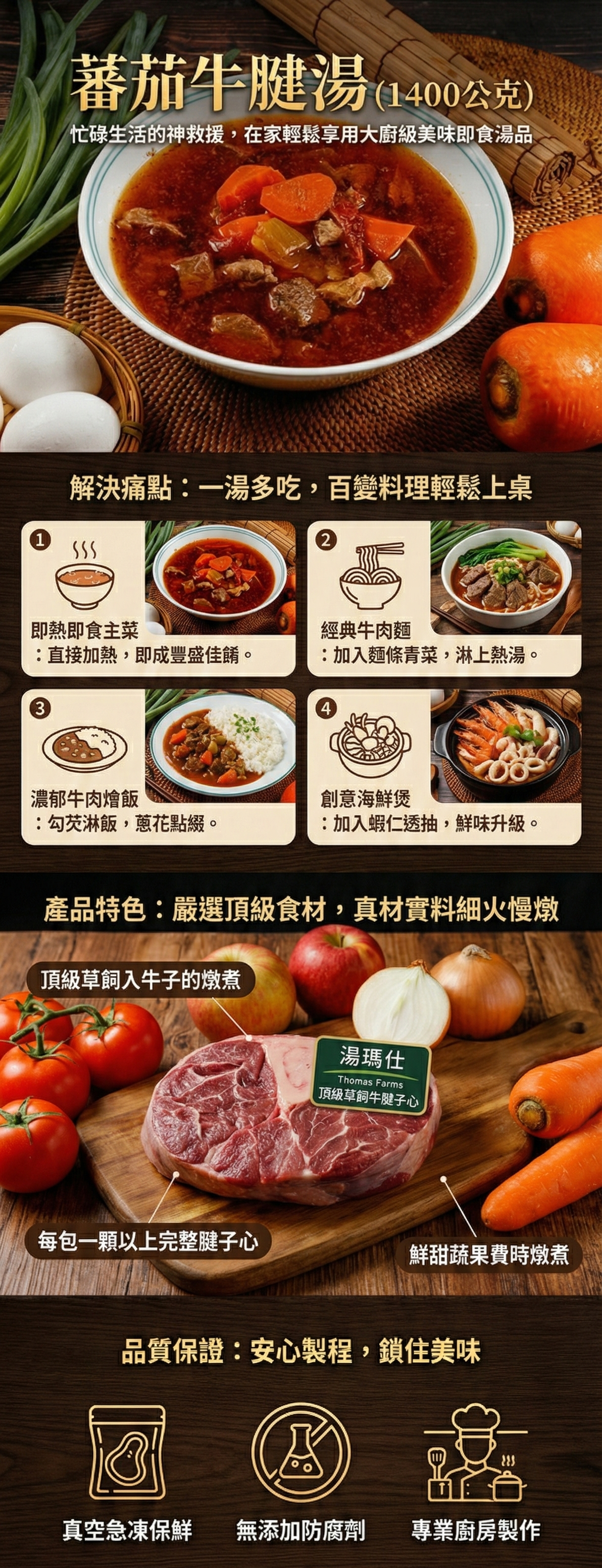 採用湯瑪仕頂級草飼牛腱子心,以洋蔥、蕃茄或蘋果和胡蘿蔔燉煮,每包有一顆以上腱子心