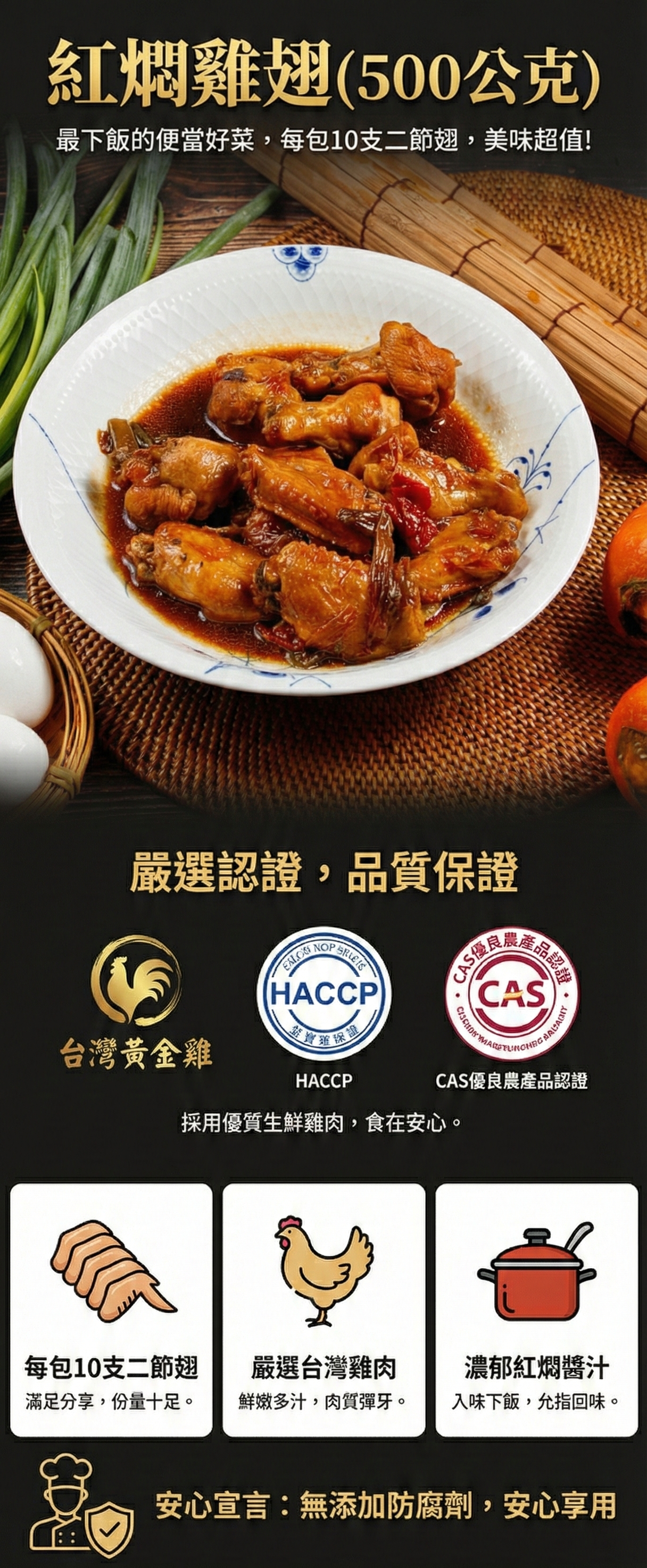 採用台灣黃金雞暨HACCP、CAS優良農產品認證雞翅,最下飯的便當好菜